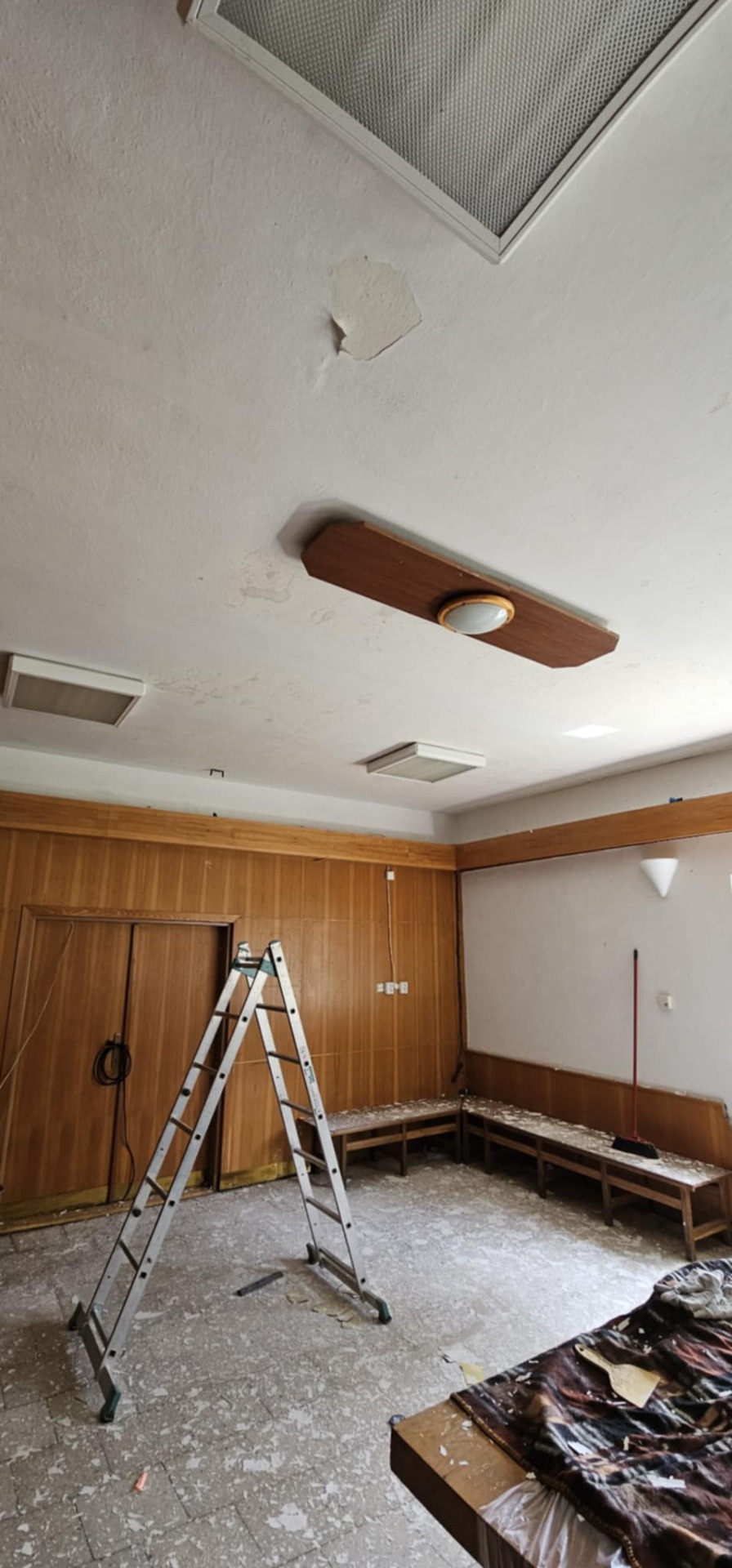 Nestačím zírat . Celá velká jídelna - stoly, židle, police, lednice, jídlo, nádobí, … všechno pokryté oloupanými střípky omítky ze stropu. Pavel vynalezl jednoduchou metodu jak strop oškrábat - prostě kompresorem! Na tmavě modrém čalounění židlí se to obzvlášť vyjímalo ☹️.