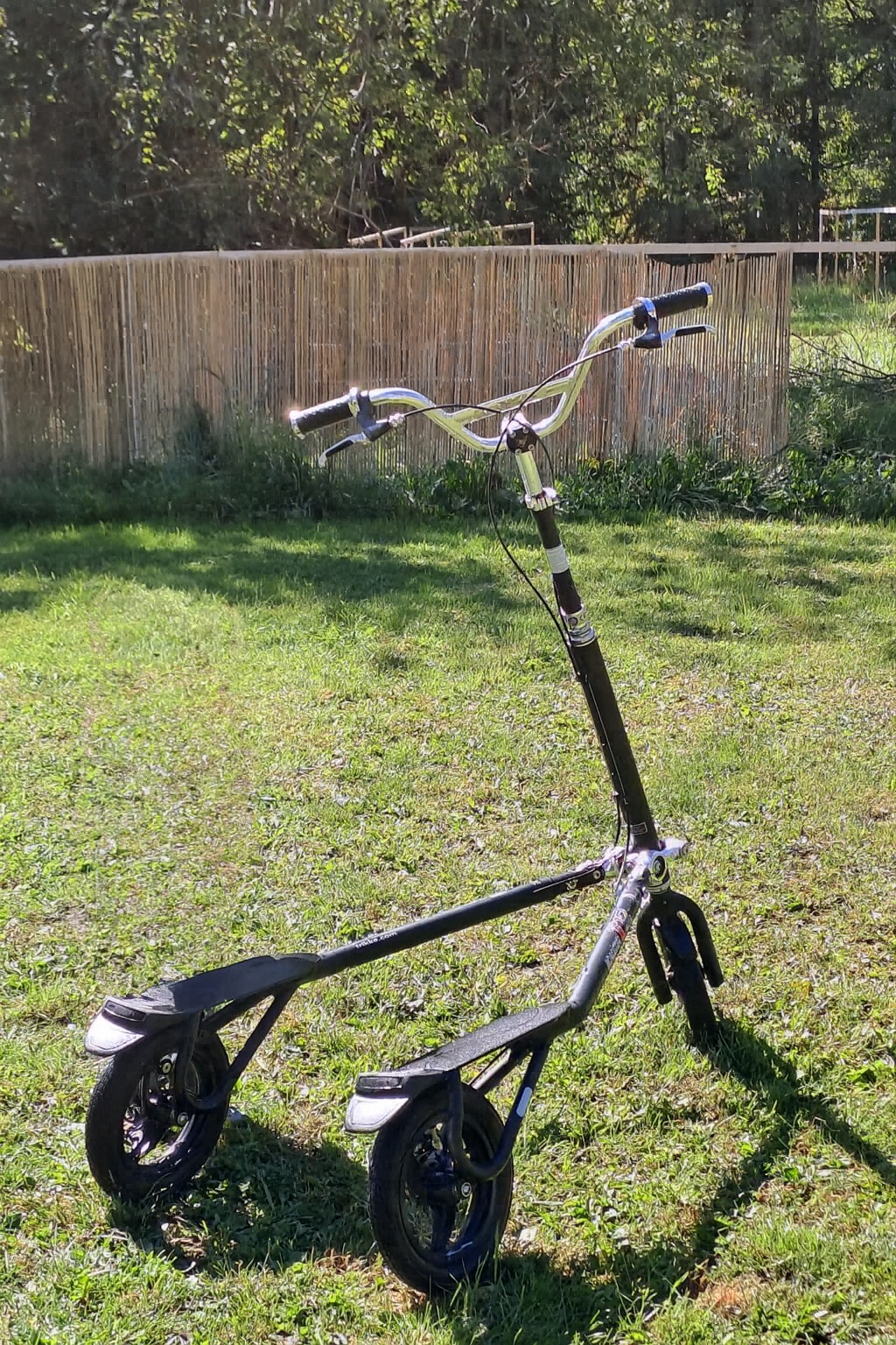 Oficiální název té věci je TRIKKE. Je to velká tříkolka pro dospělé, rozjíždí se zvláštním kývavým pohybem. Pavel ji přivezl k dubu pro zabavení hostů.